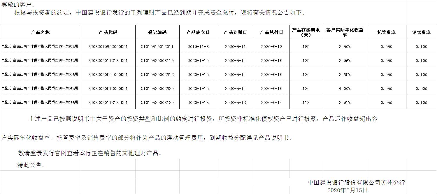中国建设银行理财产品终止及清算公告